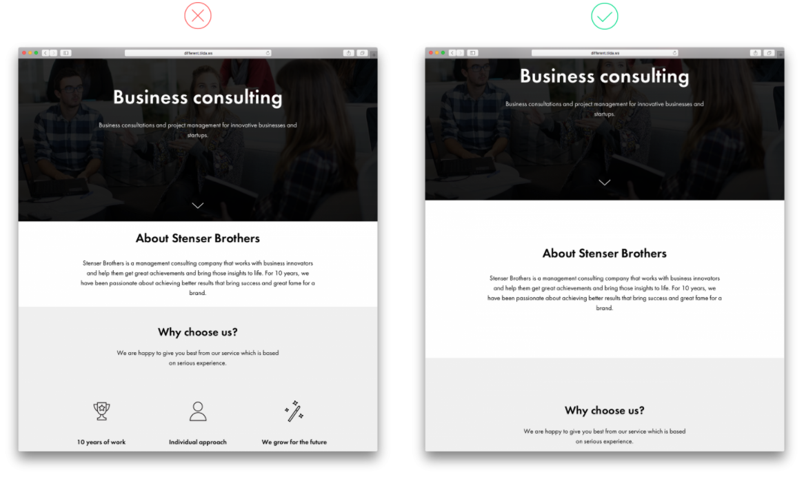 左側(cè):狹窄的填充使塊相互粘連。這會使頁面超載并且相當(dāng)混亂——網(wǎng)站訪問者被引導(dǎo)相信這是一段可靠的文本,而不是不同的部分